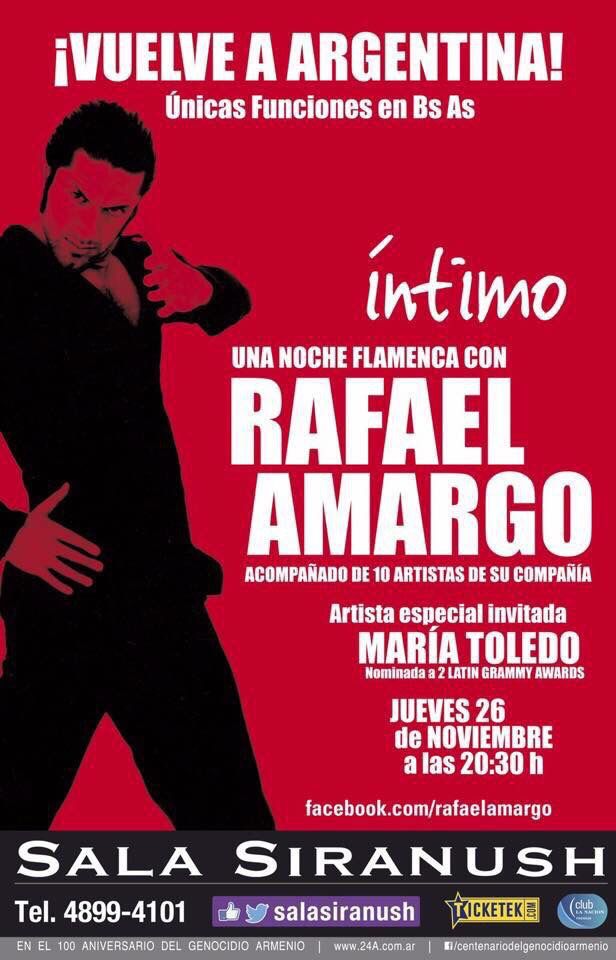 El bailaor español presentará en la Sala Siranush de Buenos Aires, el jueves 26 de noviembre a las 20:30h, su espectáculo flamenco Íntimo, una noche flamenca con Rafael Amargo, que contará con la colaboración, como artista invitada, de la cantaora y pianista María Toledo.(Nominada a los Premios Grammy Latino 2015)